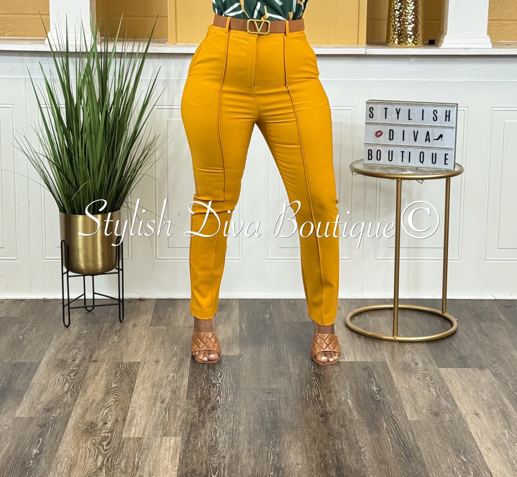 These Mya Ankle Pants in mustard offer a flattering ankle-length silhouette with a 27" inseam, perfect for a chic, polished look. Crafted from 97% polyester and 3% spandex, they provide a comfortable fit with minimal stretch. Featuring a solid pintuck design, front zipper, and a removable buckled belt, these pants combine style with versatility, making them ideal for both work and casual occasions. Elevate your wardrobe with this timeless piece that effortlessly blends function and fashion.