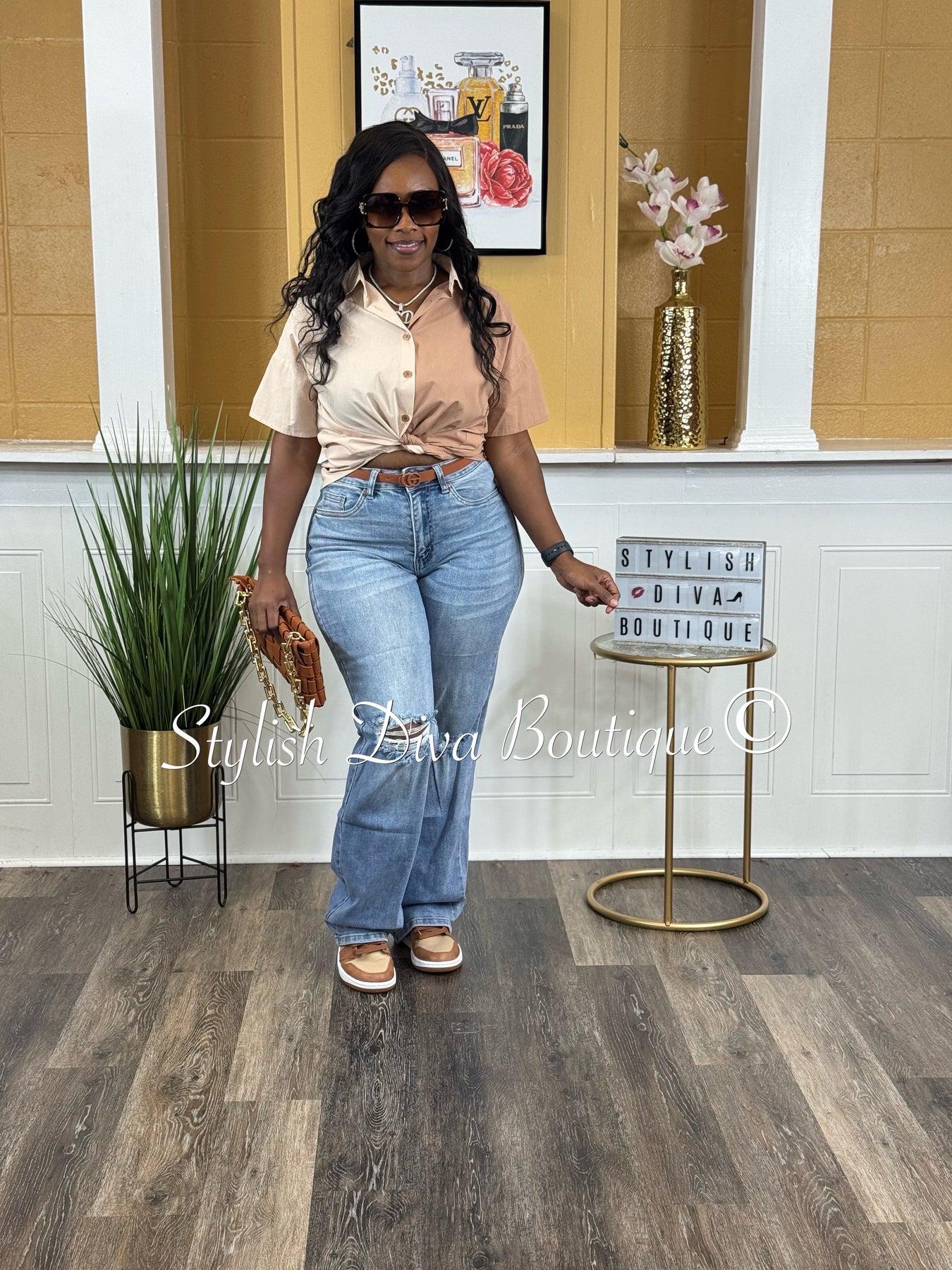 Introducing our Linden Wide Leg Distressed Jeans! These high-waisted, wide leg jeans are designed to fit true to size and provide a flattering, elongated silhouette. The stretch fabric and finished hem add comfort and style, while the distressed knees give a trendy, edgy touch. Perfect for any fashion-forward look!