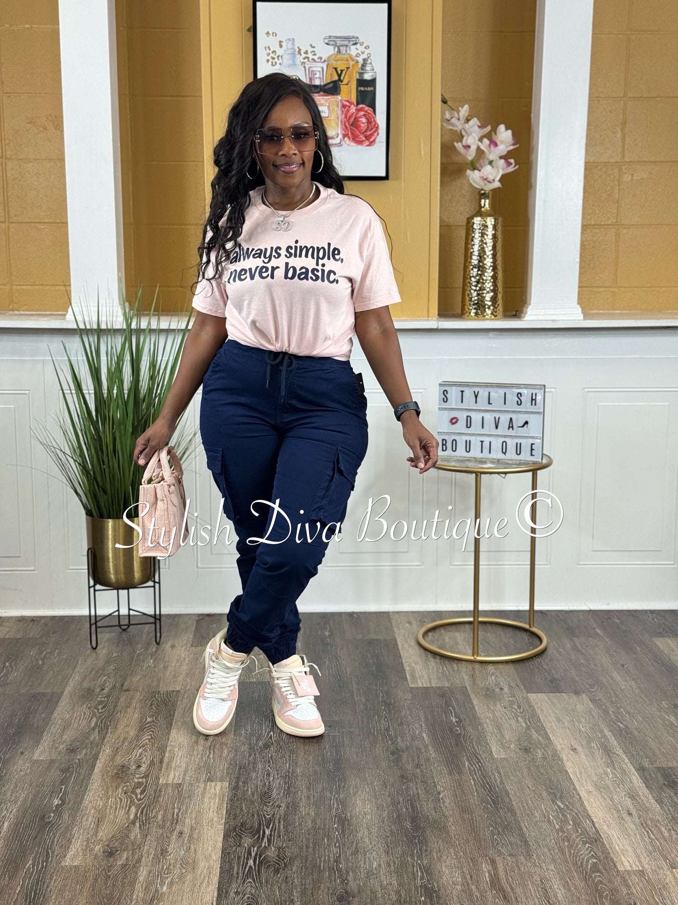 always simple. never basic. T-shirt (Blush Pink Shirt/Dark Navy Print)