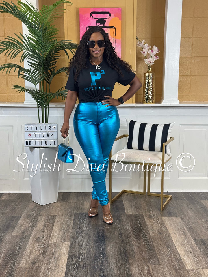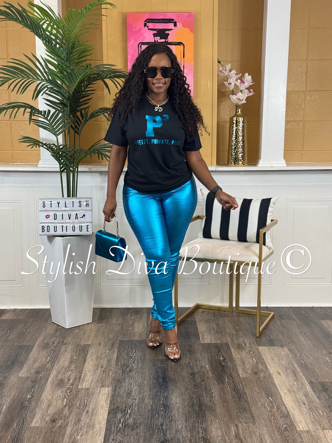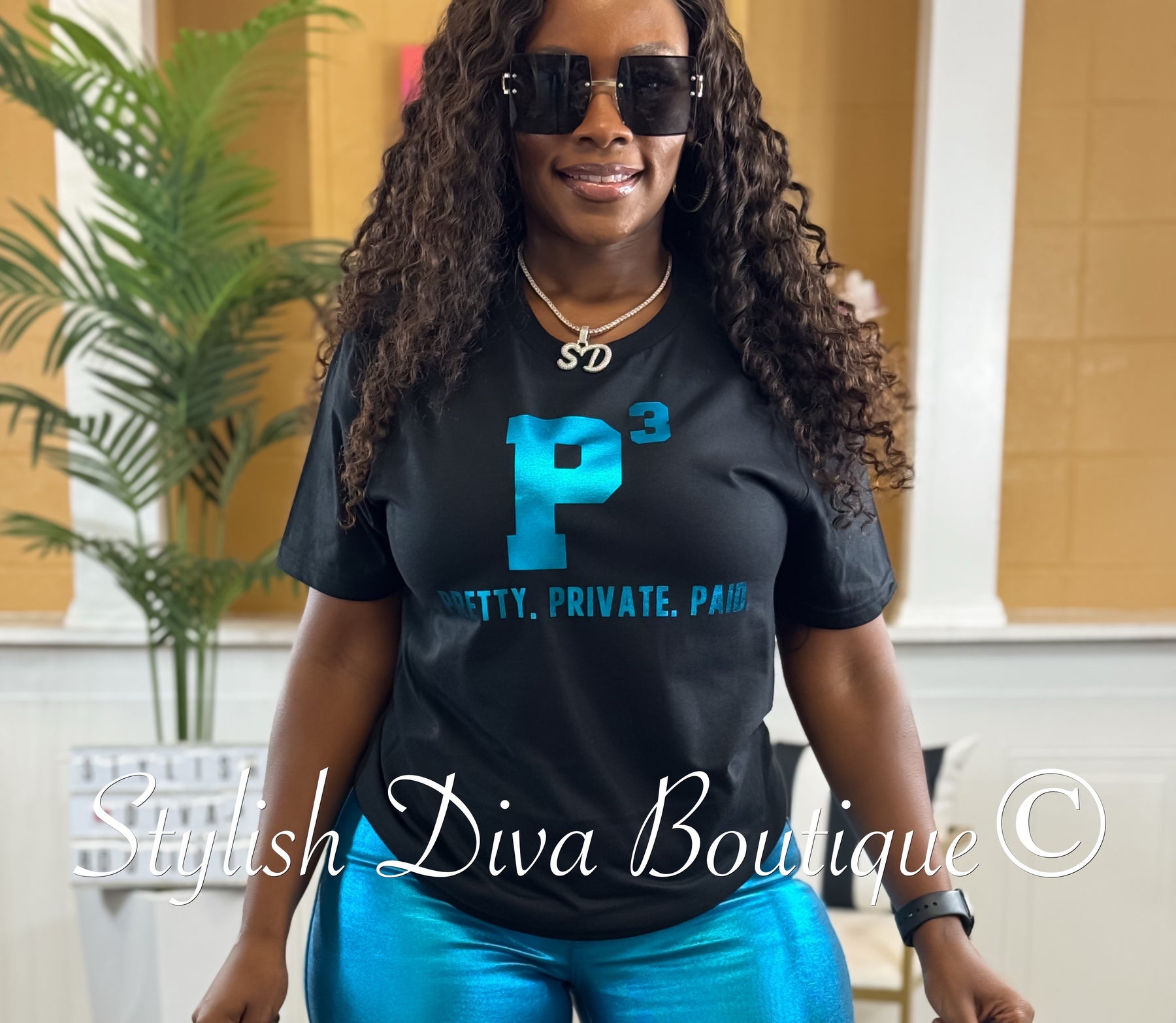P-3 Pretty. Private. Paid. T-Shirt (Black/Turquoise Foil Print)