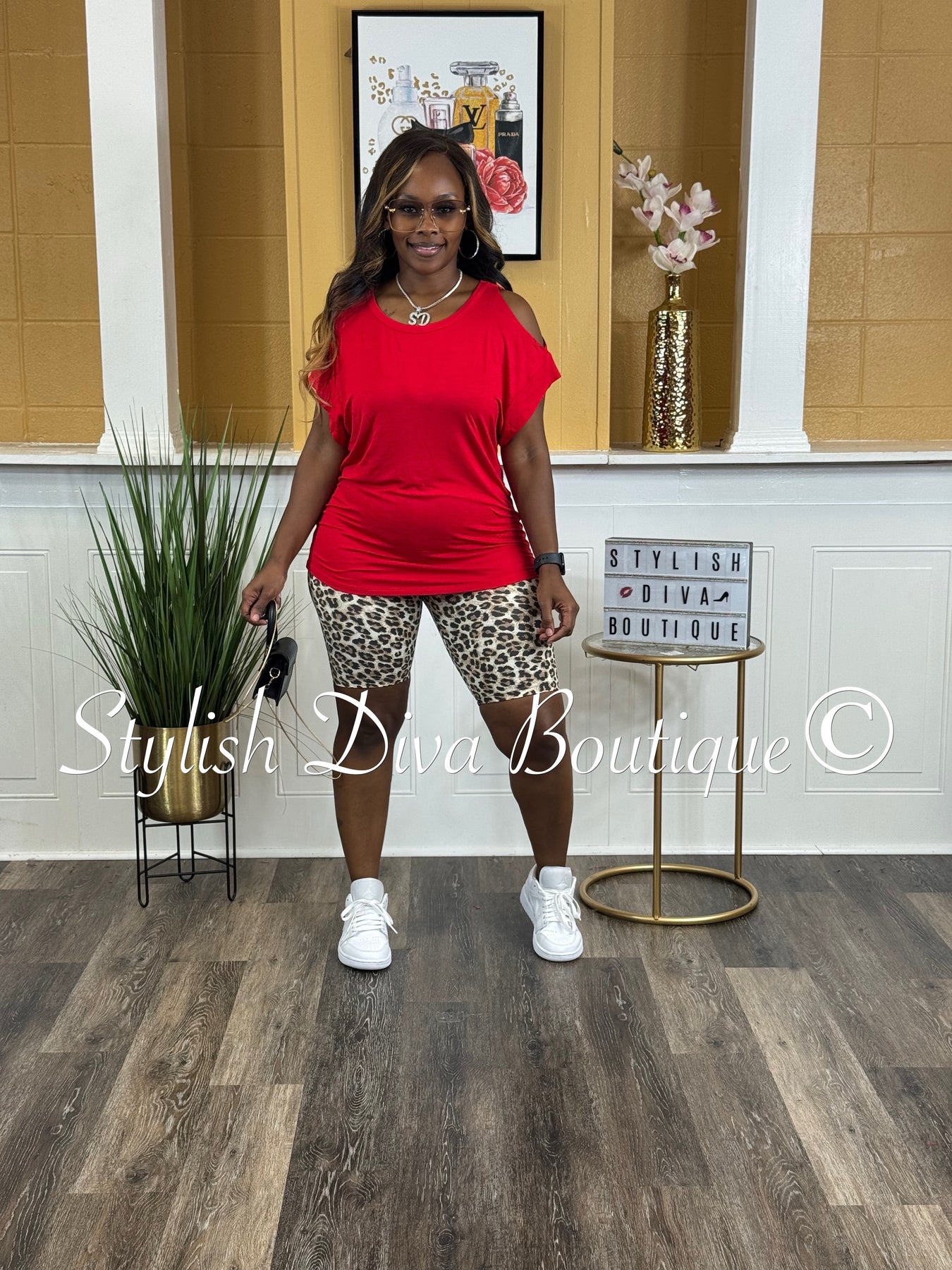 Embrace confidence with the Bold Instincts Biker Set. The loose-fit, cold-shoulder top features a flattering boat neck and rolled sleeves for effortless style and comfort. Paired with buttery-soft, brushed microfiber biker shorts in a striking leopard print, this set offers perfect stretch and recovery to keep you moving freely all day. Ideal for bold, active looks that stand out.