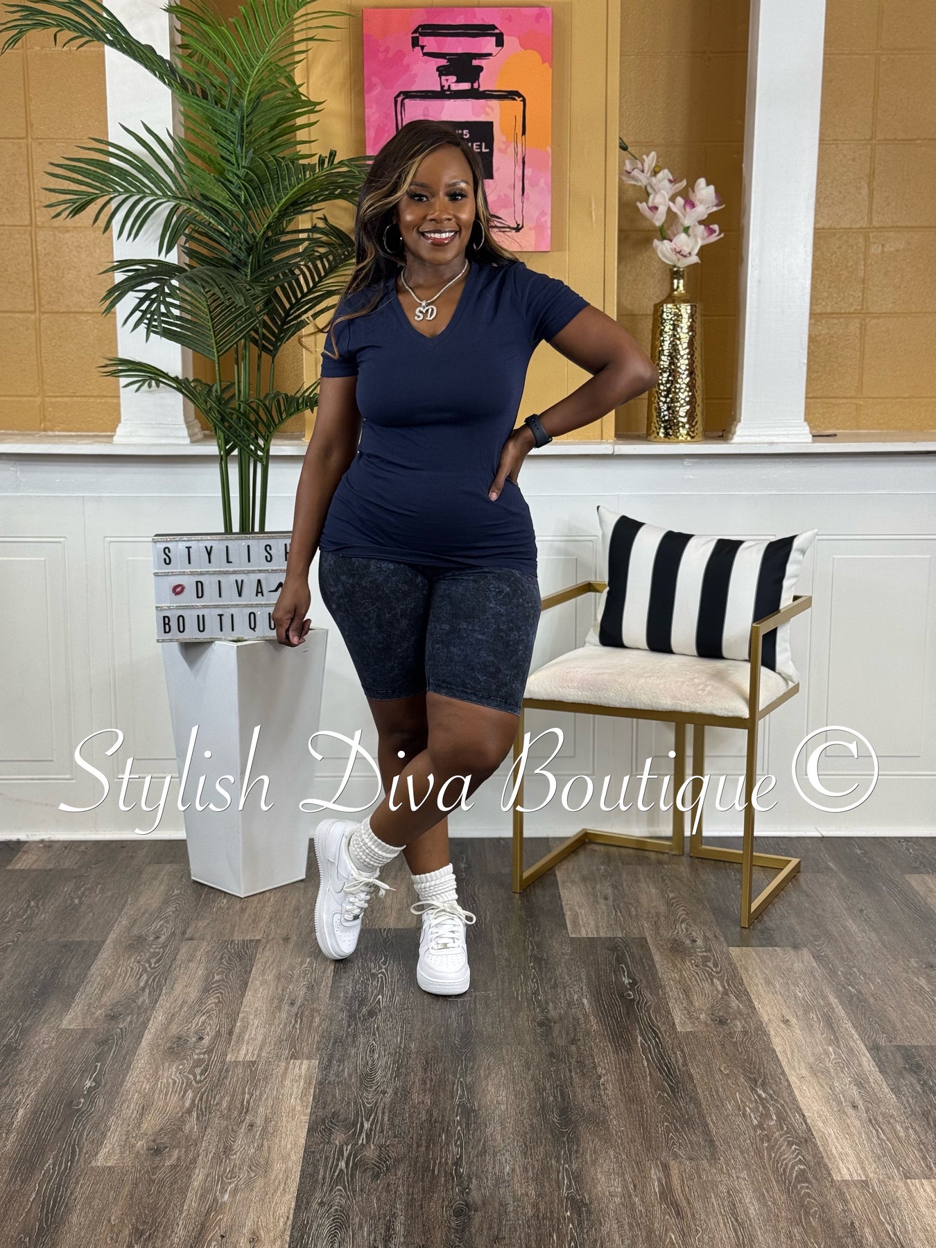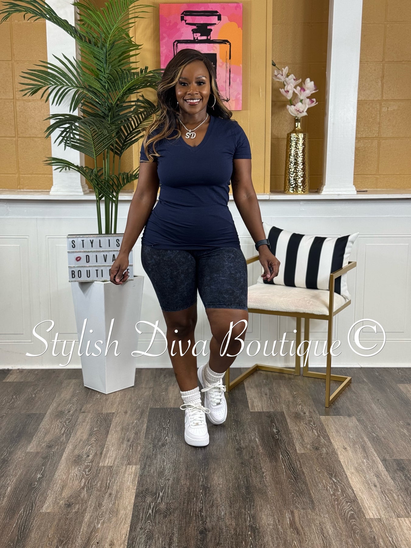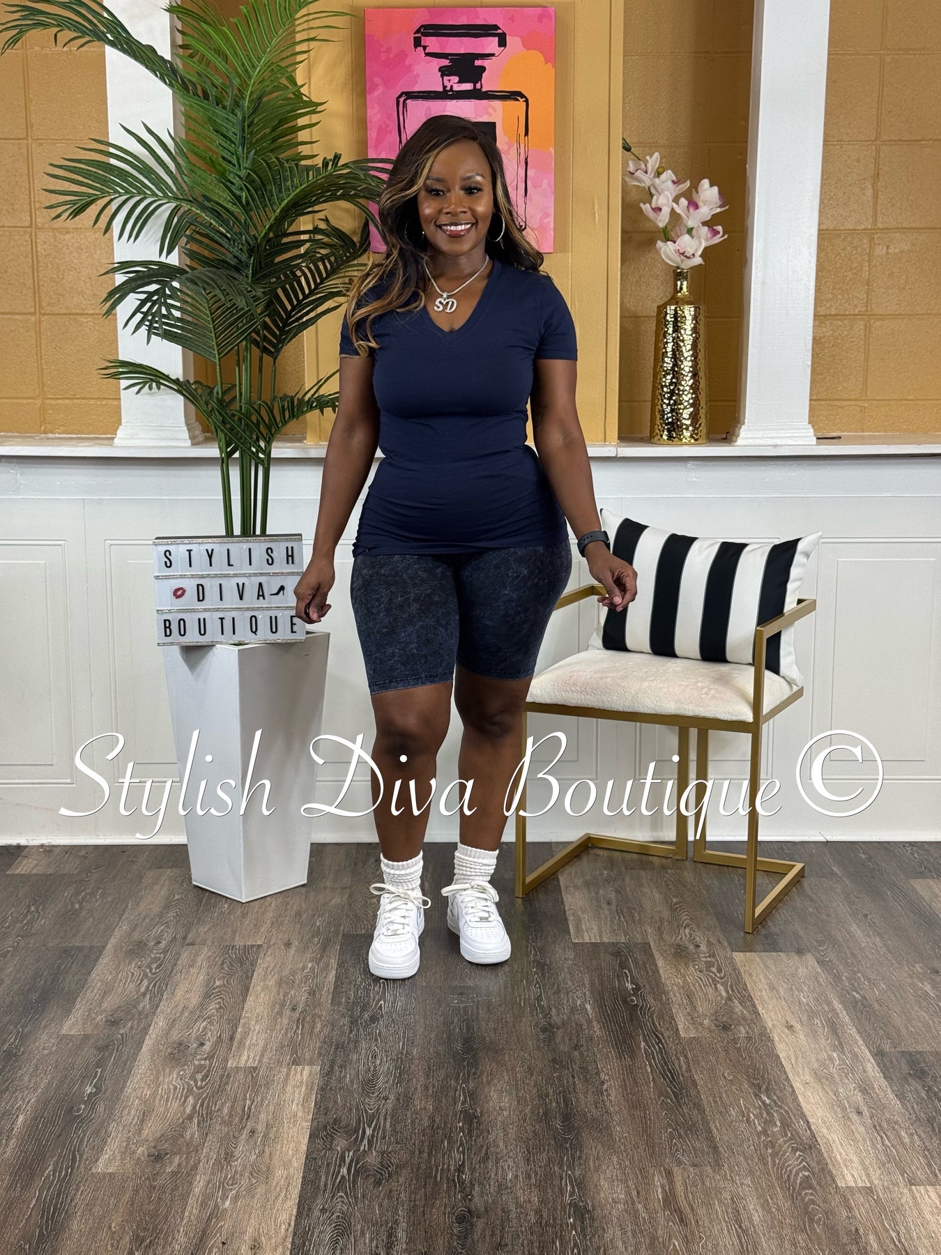 Experience effortless style and comfort with the Laid Back Biker Set in Navy/Acid Wash Blue. This set features a soft, breathable cotton blend V-neck tee with a flattering fit and stretchy biker shorts that move with you. Each piece offers a unique mineral wash finish, ensuring your look is one-of-a-kind. Perfect for casual days or active moments, this set combines comfort and trend effortlessly.