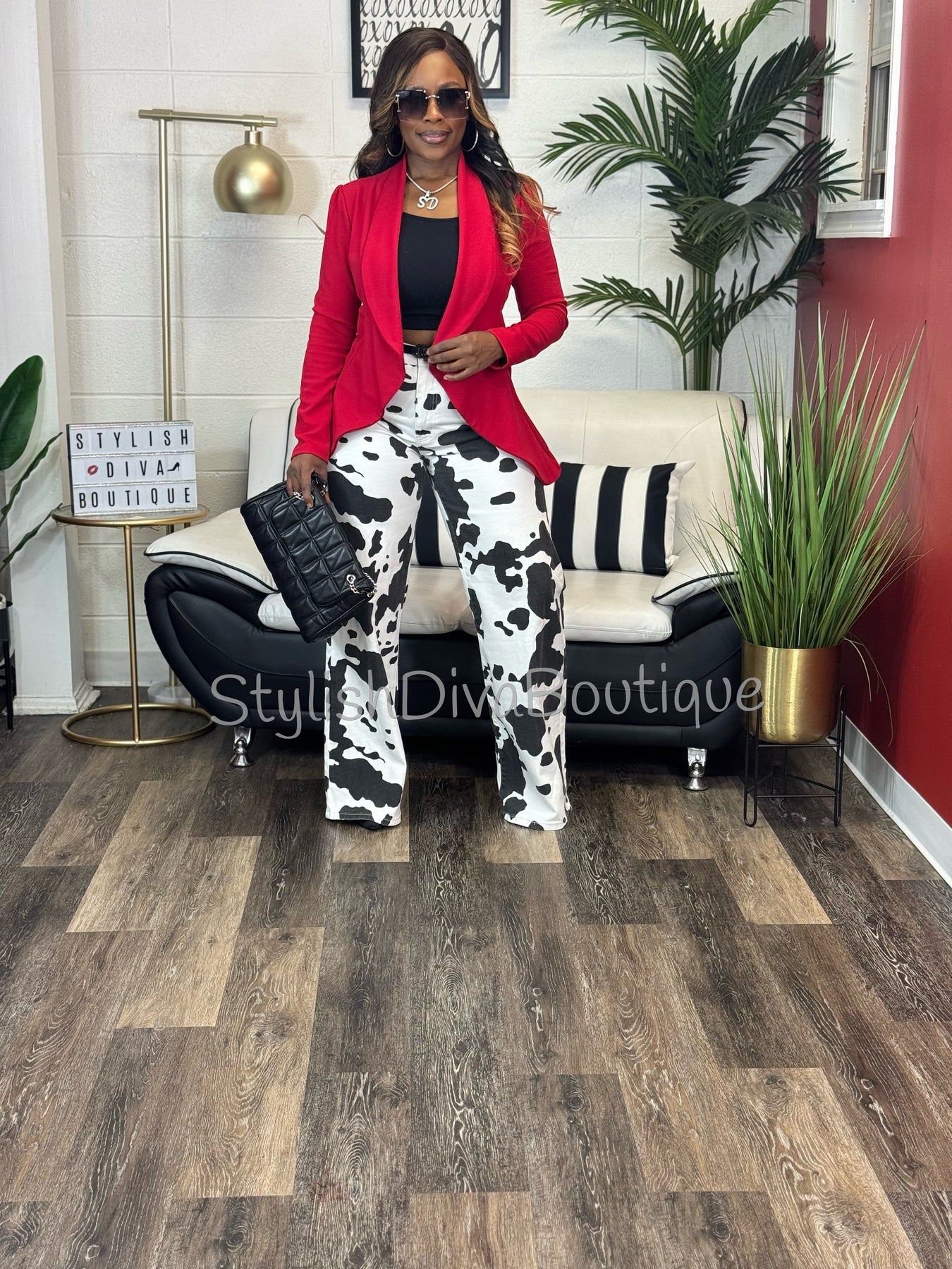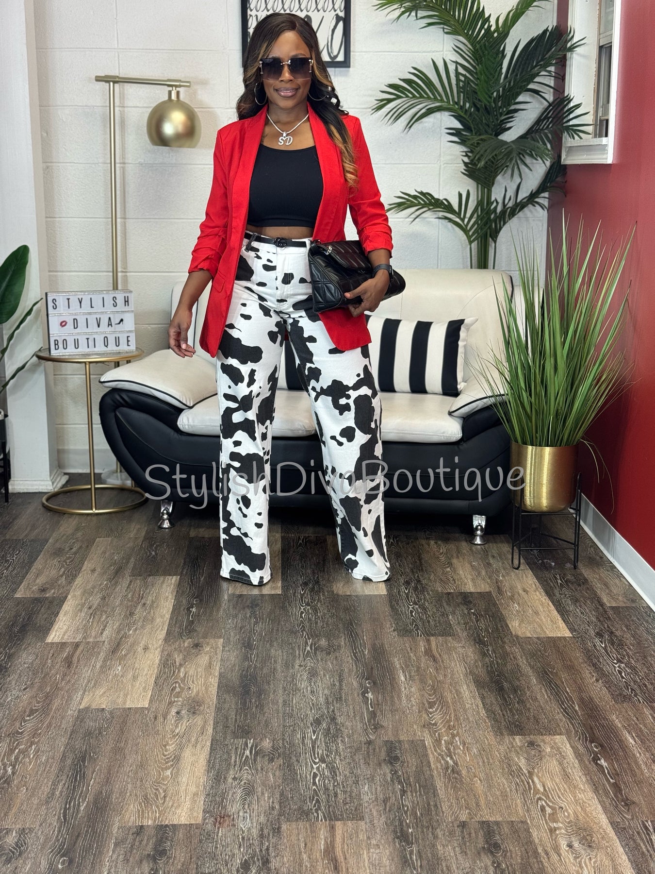 The Midnight Rodeo Statement Jeans feature a bold black and white cow print paired with a flattering high-rise, wide-leg silhouette that elongates your legs and elevates your entire look.