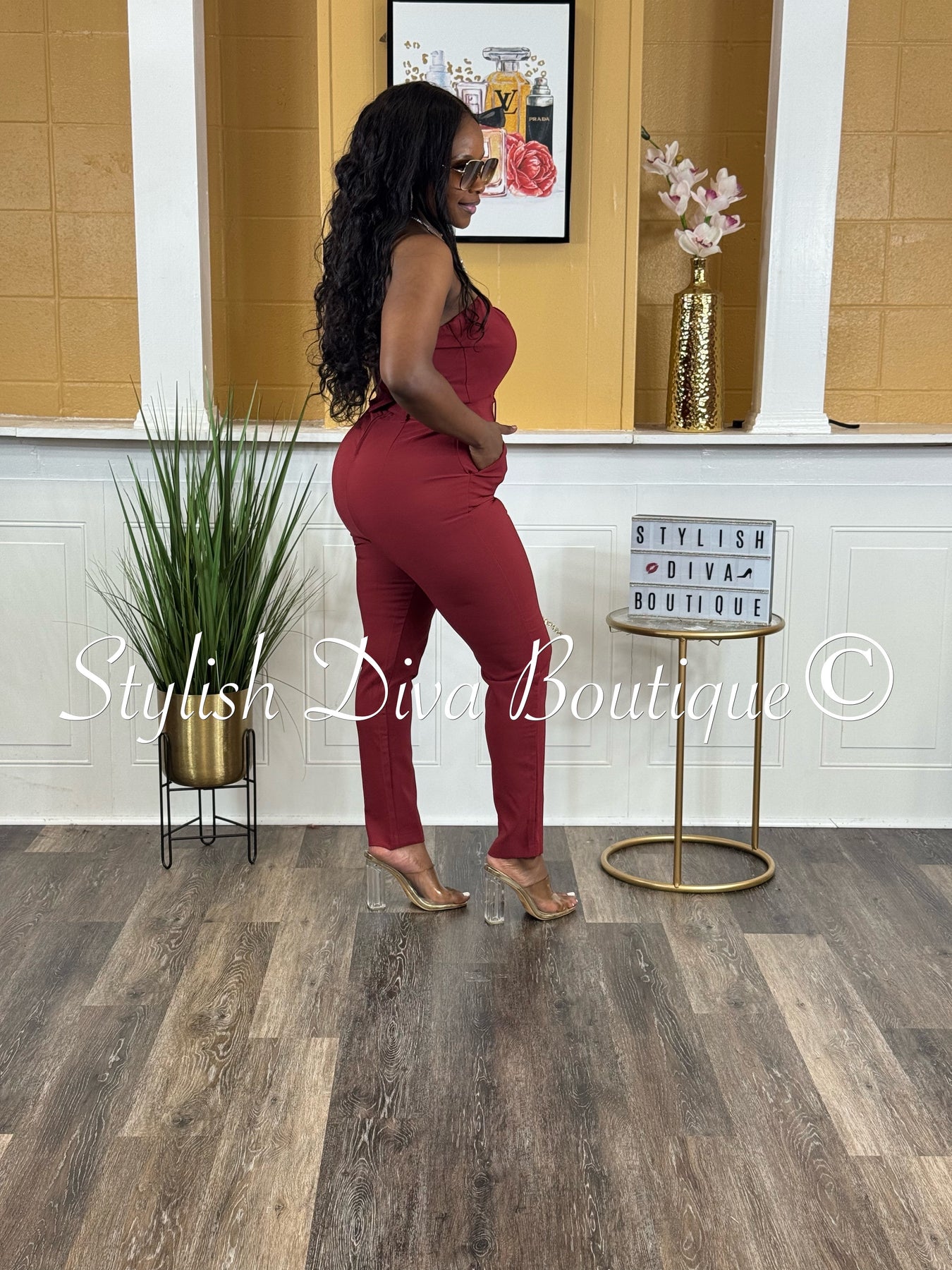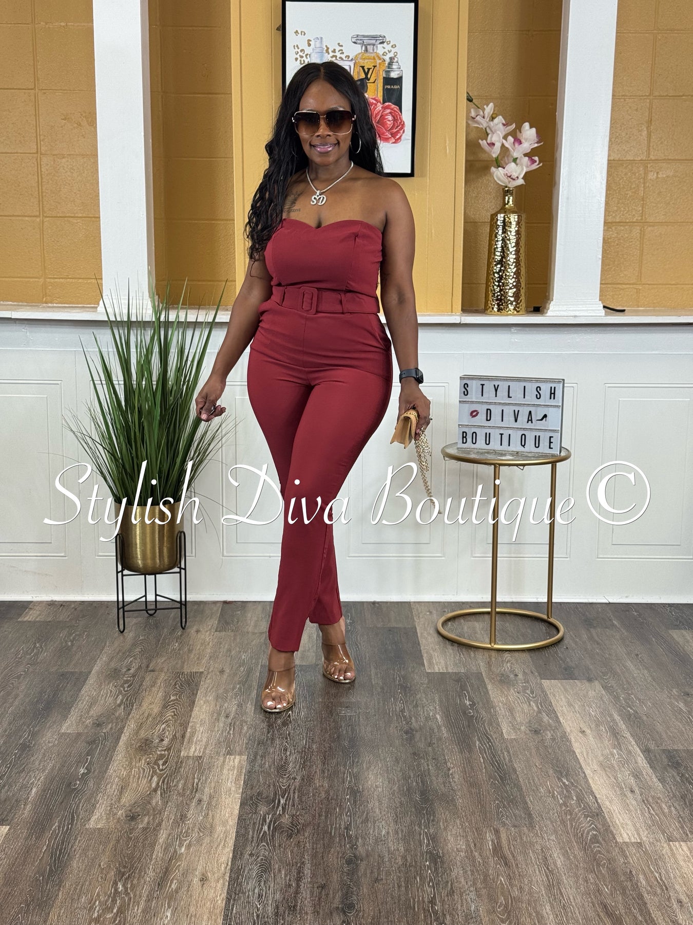 Burgundy Twill Square Buckled Bustier Jumpsuit