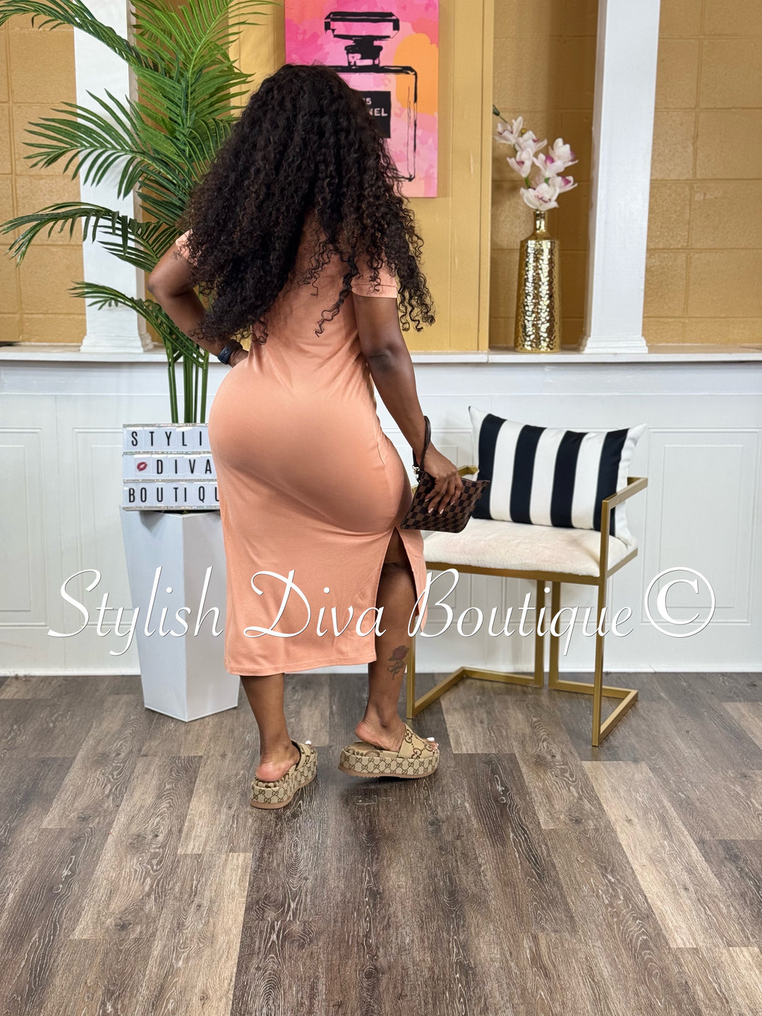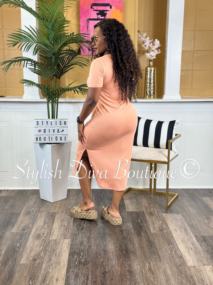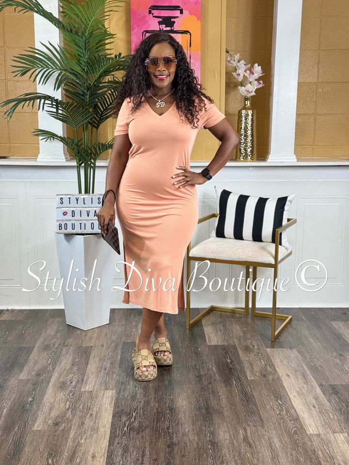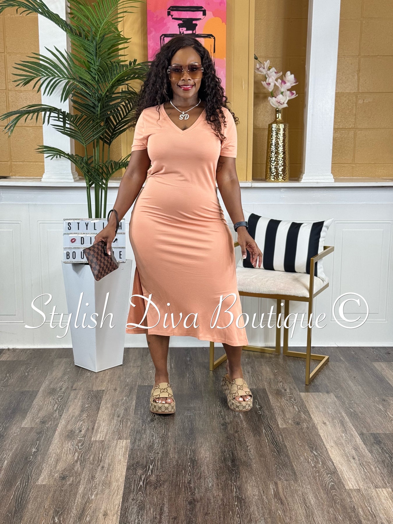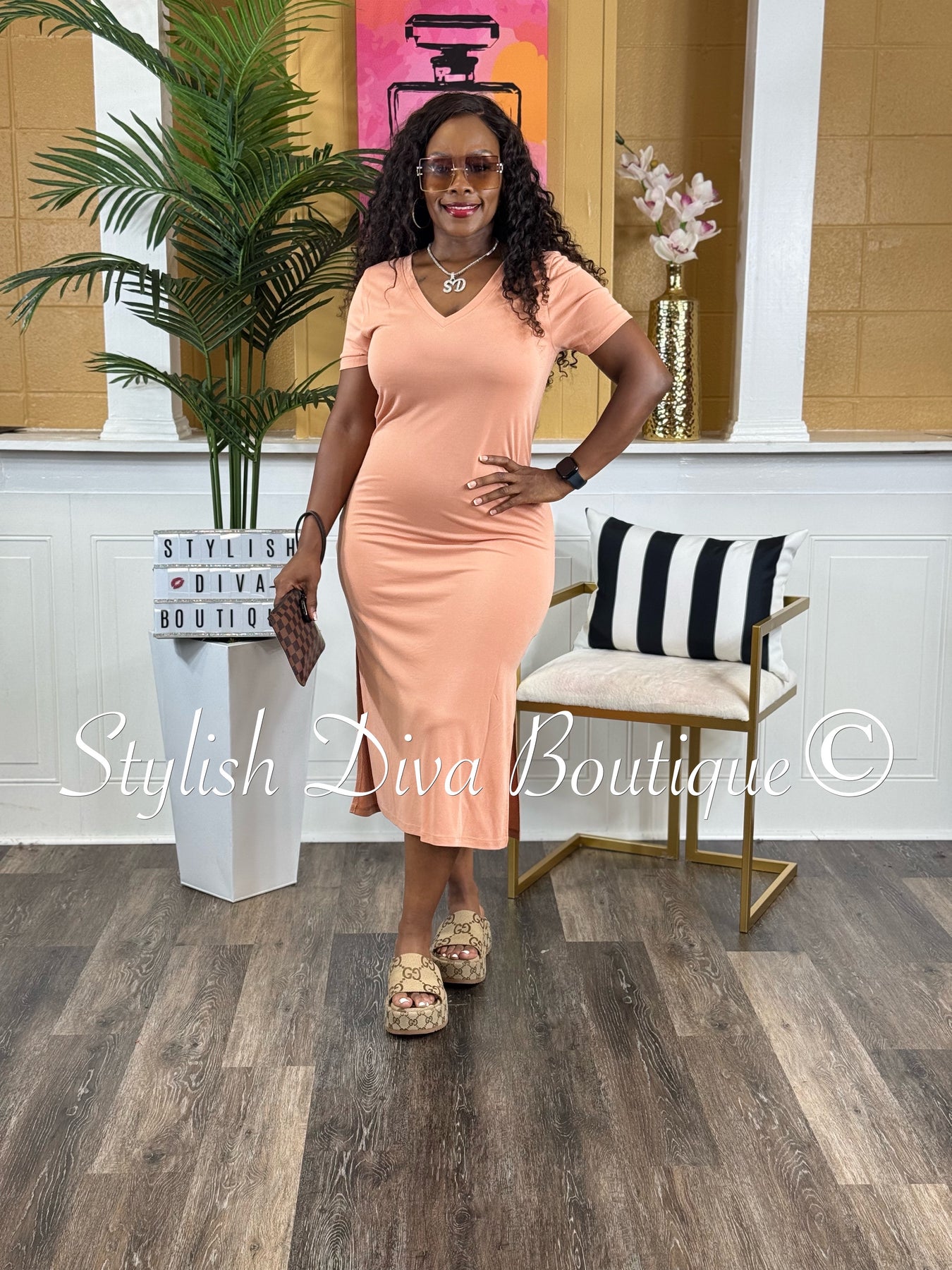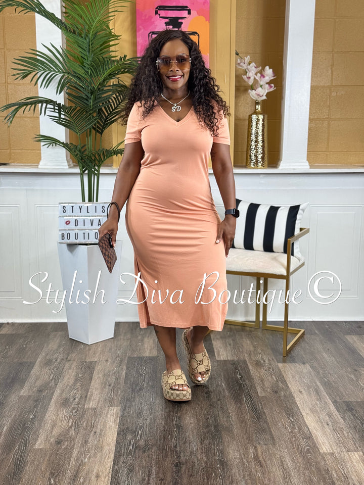 The Ivy Shirt Dress in Caramel offers effortless style with its flattering V-neckline and relaxed short sleeves. Crafted from a soft blend of modal and polyester, this midi-length dress features a shaped bodice that flows into a comfortable, stretchy silhouette with side splits for added movement. Perfect for casual days or everyday wear, it fits true to size and requires no buttons or closures, making it an easy, chic choice for your wardrobe.
