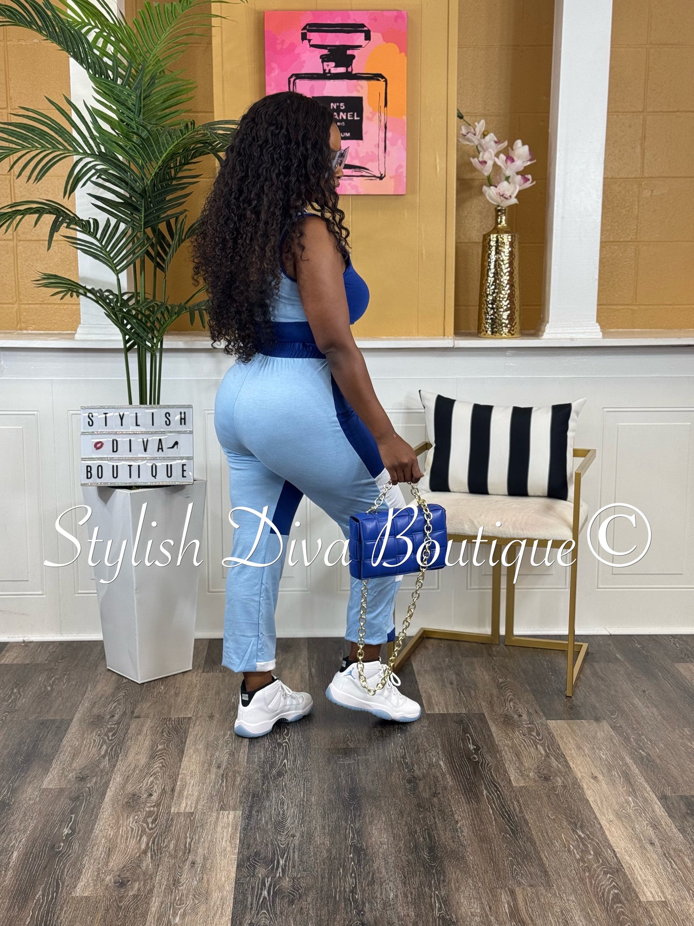 Elevate your athleisure wardrobe with our Jeri Colorblock Jogger Set in stunning shades of blue. This French Terry ensemble features a stylish tank crop top paired with elastic waistband jogger pants, creating the perfect balance of comfort and fashion. The eye-catching color block detail adds visual interest, making this set versatile enough for workouts, errands, or casual meetups. You'll love how effortlessly chic you feel while enjoying maximum comfort.