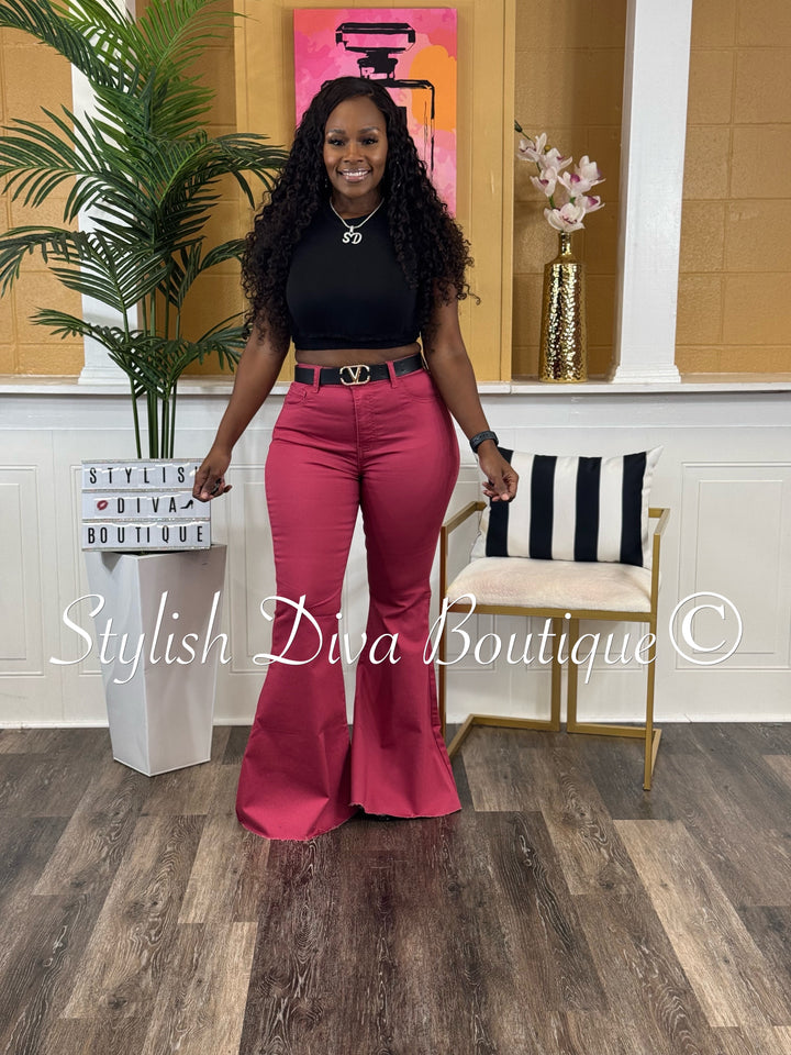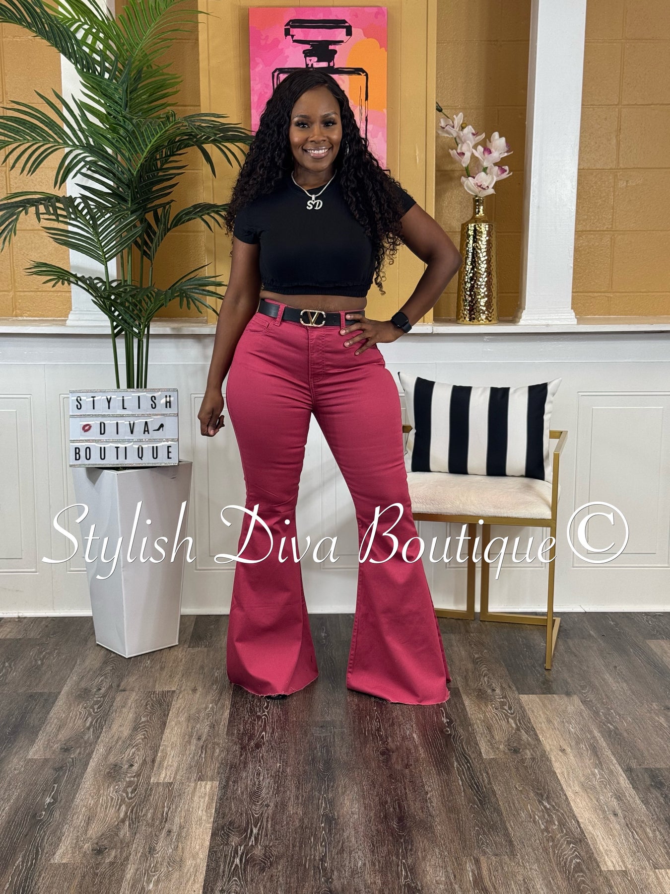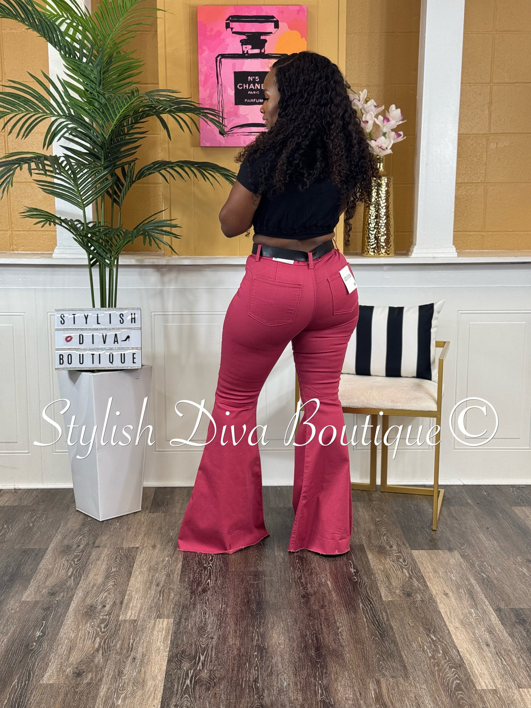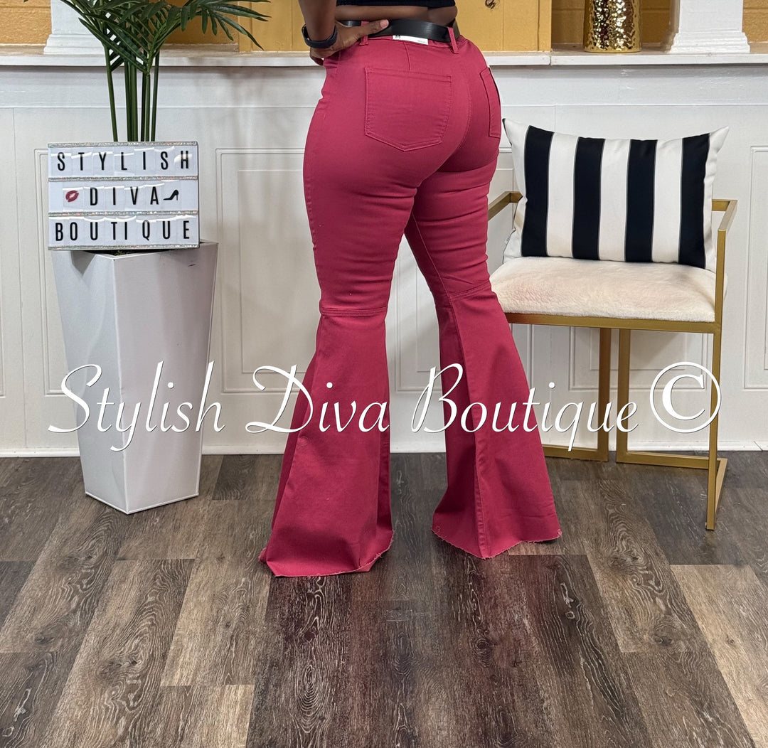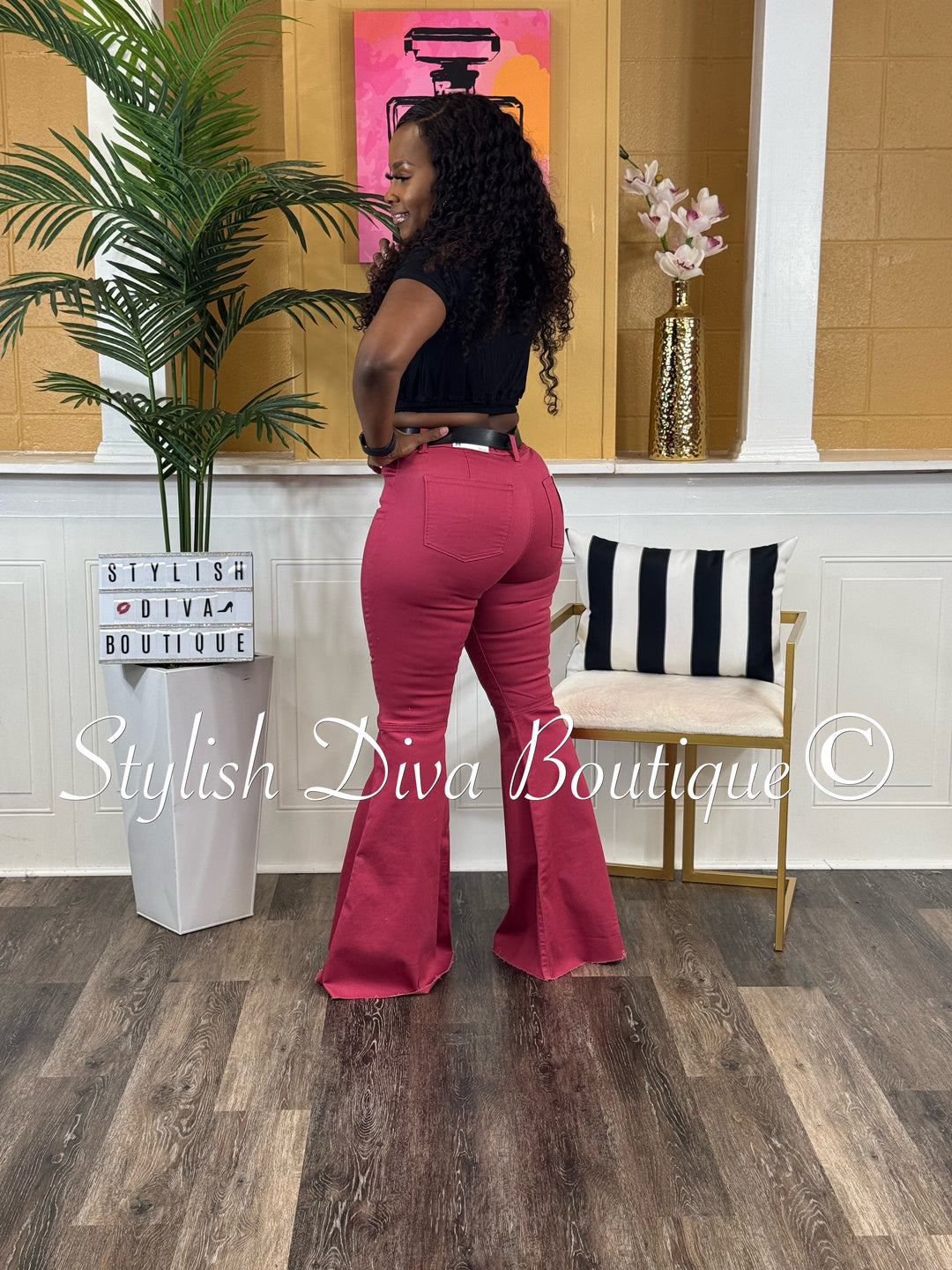 Elevate your style with our Jordyn High Waist Colored Pants in Red! These high-rise, super flare denim pants provide a comfortable stretch and feature a raw hem and 5 pockets for convenience. With a 10 3/4" front rise and a 32 1/2" inseam, these pants are perfect for any occasion. Stand out in these bold pants with a 35" leg opening.